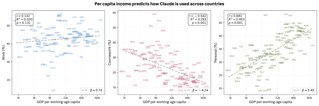 Ancak kişi başına GSYİH’sı düşük ülkelerde, Claude’un en temel rolü “öğretmen”, büyük ölçüde ders ödevleri ve eğitim danışmanlığına odaklanmış.