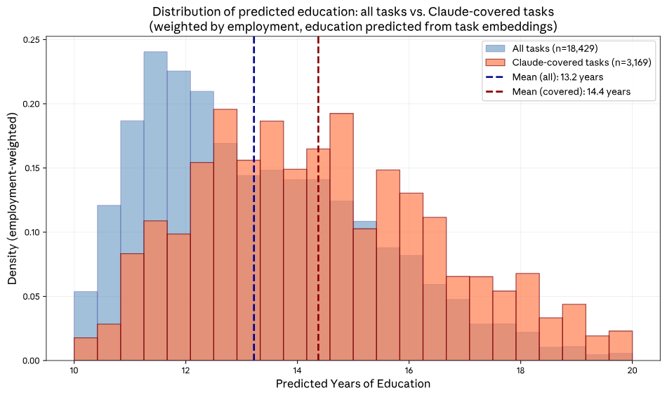 Veriler, Claude’un şu anda kapsadığı görevlerin ortalama 14.4 yıl eğitim geçmişi gerektirdiğini (yaklaşık önlisans derecesi), genel ekonomik aktivitelerin ortalama gereken 13.2 yıldan çok daha yüksek olduğunu gösteriyor.