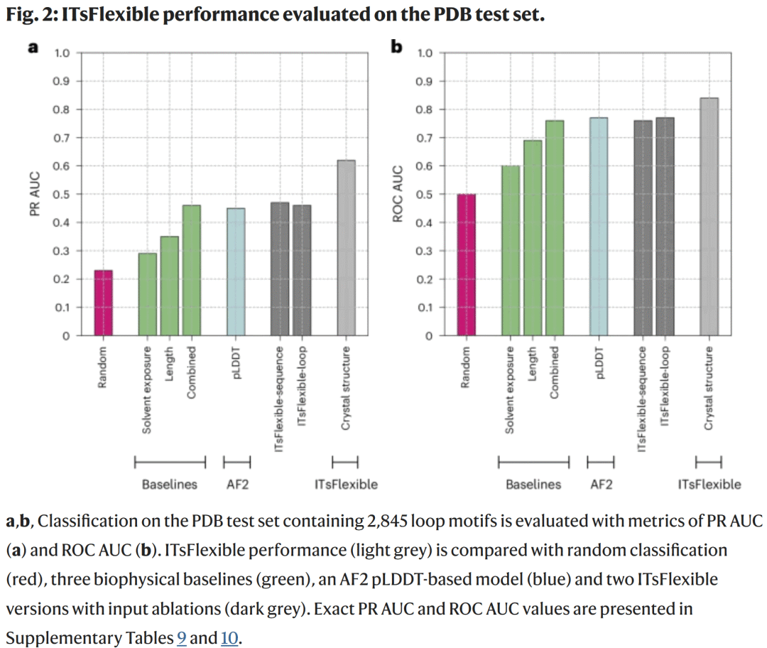 PDB test setinde, ITsFlexible’ın ROC AUC’si 0,84’e ulaşır ve PR AUC’si 0,62’dir; bu, tüm temel ve sıfır numune yöntemlerinden önemli ölçüde daha iyidir (Şekil 2). Model ablasyon deneyleri, yalnızca döngü dizileri veya yerel yapılar kullanan modellerin performansının düştüğünü gösteriyor, bu da döngülerin çevreleriyle etkileşiminin esnekliğin önemli bir belirleyicisi olduğunu gösteriyor.