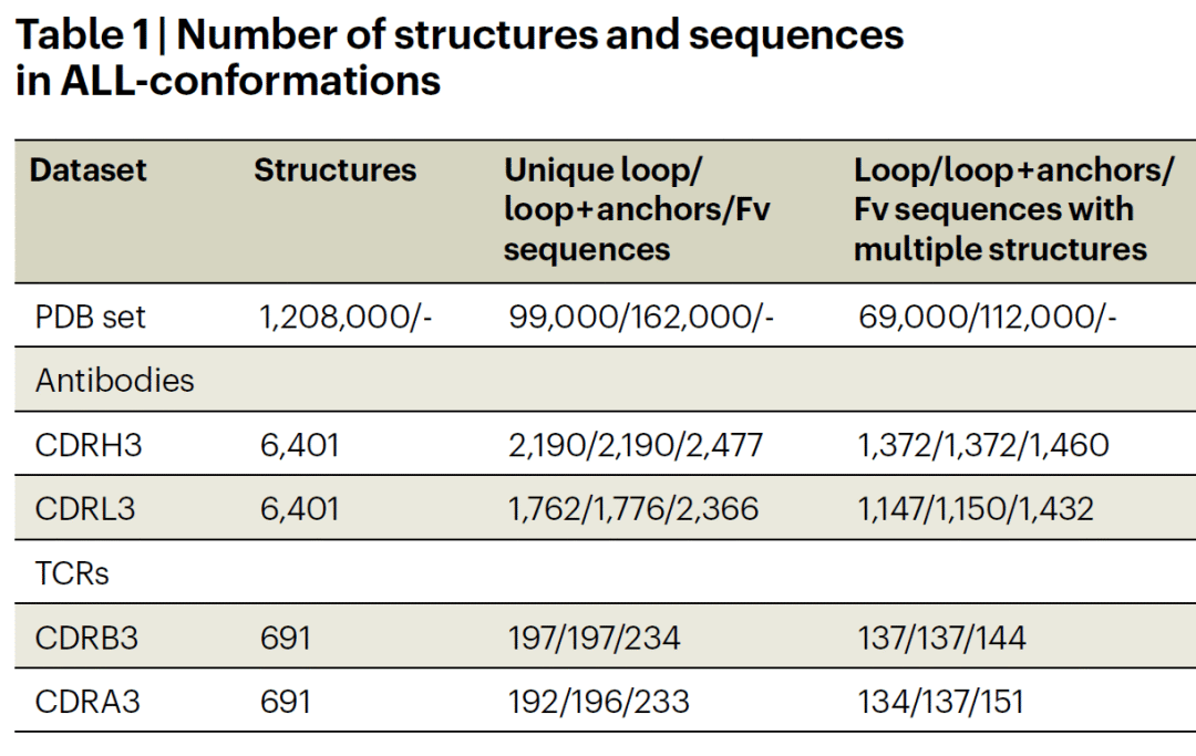 Araştırmacılar, beş alt küme içeren ALL konformasyon veri setini oluşturmak için PDB’den iki antiparalel β-iplikçik ile çevrelenmiş halka yapılarını sistematik olarak incelediler: antikorlar CDRH3, CDRL3, TCR CDRB3, CDRA3 ve tüm proteinlerdeki benzer halka yapıları. Veri seti, deneysel olarak gözlemlenen tüm konformasyonel durumları kapsayan toplam 1,2 milyon kristal yapı ve yaklaşık 100.000 benzersiz dizi içerir.
