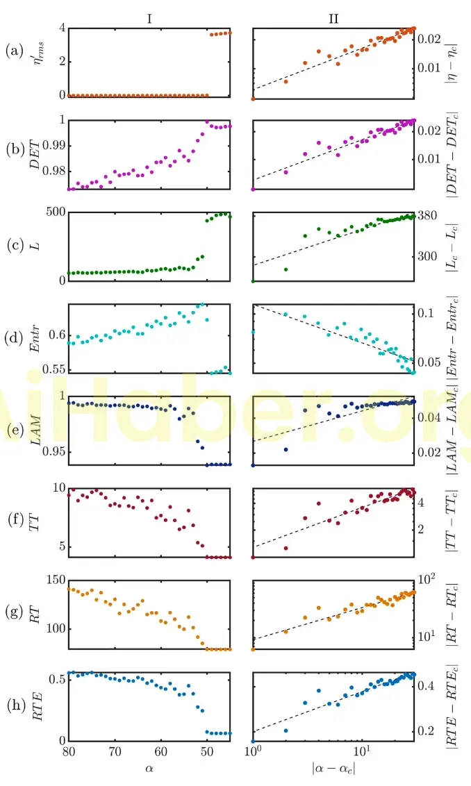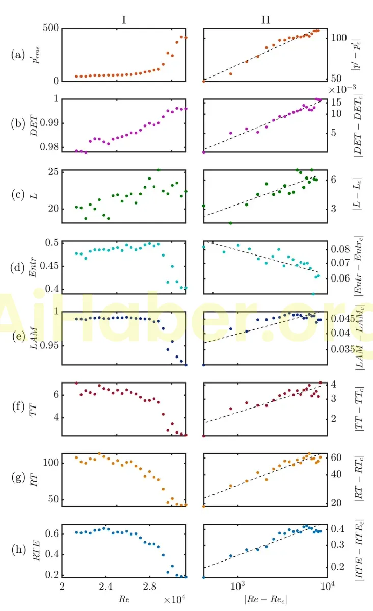 Şekil 3. Kritik nokta yakınında RQA metriklerinin ölçeklendirilmesi. Kontrol parametresi Re’nin bir fonksiyonu olarak p’ rms I(a) ve döngüsel ölçümler I(b–h). Tüm döngü tabanlı ölçümlerin periyodik salınımlara geçişi önceden tahmin ettiğini gözlemliyoruz. Kontrol parametresindeki (Re) karşılık gelen farklar ile kritik noktadaki değeri (Rec = 2,96 ± 0,069 × 10⁴) arasında bir güç yasası ölçeklendirme ilişkisi vardır (I(a–h)). Rec’de, hem kaotik hem de periyodik özellikler sergileyen aralıklı bir davranış vardır.