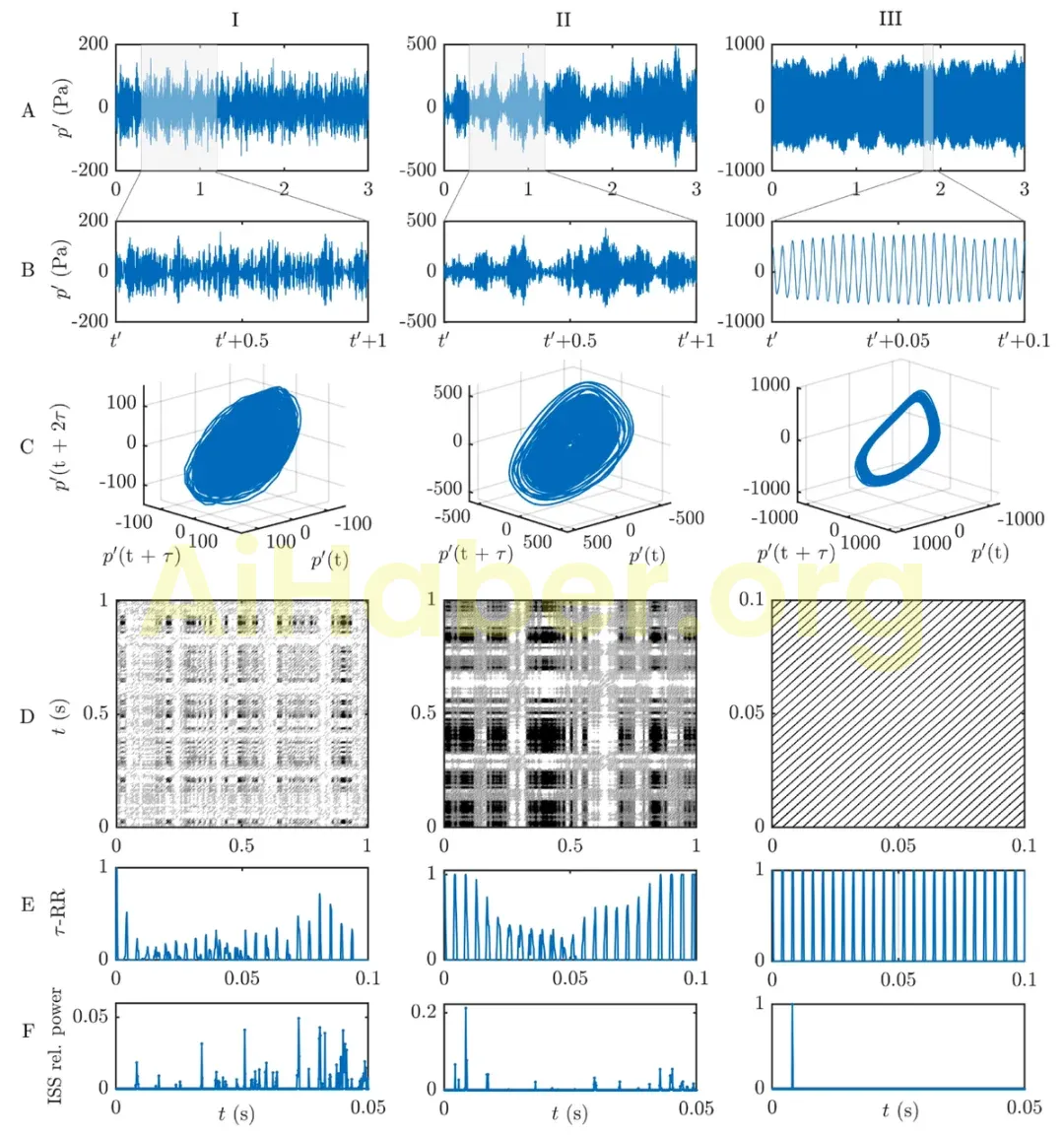 Döngüsel yoğunlaşmanın τ-geri dönüş oranı ve tepe-arası spektrumu kullanılarak görselleştirilmesi. Yanma gürültüsü durumu I-(a) (Re= 2.13 × 10 4 ’ta kaotik durum), aralıklı durum II-(a) (Re= 2.88 × 10 4 ) ve termoakustik kararsızlık durumu III-(a) (Re= 3.09 × 10 4 ’deki LCO durumu) altında yanma odasındaki kayma blokları içindeki akustik basınç dalgalanmalarının zaman serileri. İlgili faz diyagramları bu sistemlerdeki (I–III) çekici kümelerin evrimini göstermektedir (C). Sırasıyla 1, 1 ve 0.1 s (B) olan zaman serisi pencereleri, çekicinin boyutuna karşılık gelen %20’lik döngü eşiği kullanılarak RPs (D) oluşturulmuştur. (I)–(III)(E) için τ-RR. (I)–(III)(F) ise (I)–(III)(E)’de gösterilen τ-RR’lerin tepe-arası spektrumudur. Yanma gürültüsünden salınım kararsızlığına geçiş sürecinde τ-RR geniş dağılımdan tek bir değere dönüşür; bu, ISS’de geniş spektrdan baskın moda doğru bir yoğunlaşma olarak ortaya çıkar.