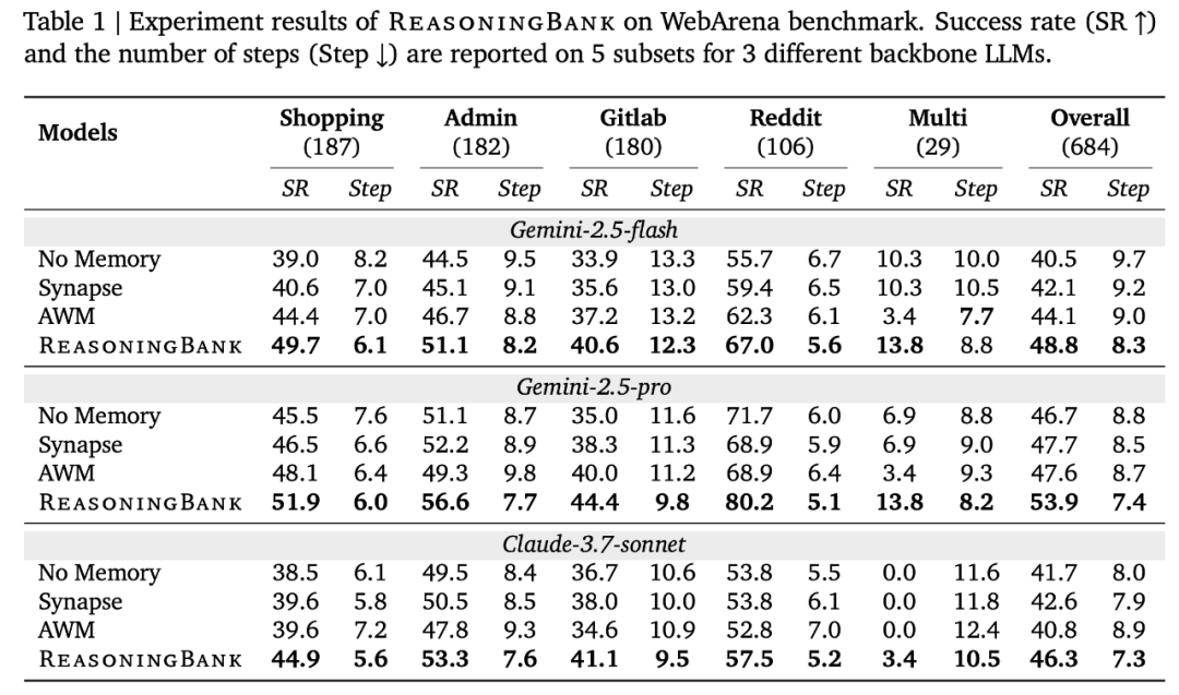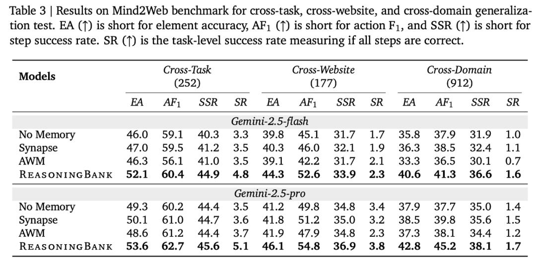 Tablo 1, 2 ve 3, ReasoningBank’in sırasıyla WebArena, Mind2Web ve SWE-Bench-Verified’daki değerlendirme sonuçlarını göstermektedir; bu, etkililik (%34,2’ye kadar göreceli iyileşme) ve verimlilik (%16,0’a kadar azaltılmış etkileşim adımları) açısından temel yöntemden daha iyi olduğunu göstermektedir.