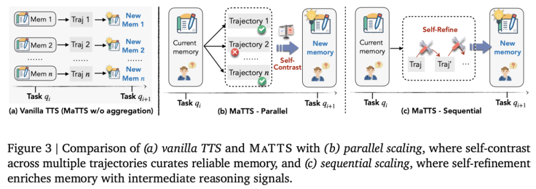 tTS: Bellek algısının test süresinin uzatılması. ReasoningBank’ın test süresi genişletmeyle doğrudan kombinasyonu Şekil 3(a)’da gösterilmektedir; burada daha fazla iz bağımsız olarak daha fazla bellek öğesine dönüştürülür. Ancak bu temel yaklaşım ideal değildir çünkü aynı sorun üzerinde gereksiz araştırmalardan gelen zıt sinyallerden faydalanmaz, bu da test zamanı ölçeklendirmesinin performans faydalarını sınırlar. Bu amaçla Google, ReasoningBank ile test süresi uzatmalarının yeni bir entegrasyonu olan MaTTS’yi önerdi. Temel yöntemlerin aksine MaTTS, belleği daha verimli bir şekilde düzenlemek için genişletme süreci sırasında oluşturulan çok sayıda başarı ve başarısızlık yörüngesinden kasıtlı olarak öğrenir. Google, MaTTS için iki tamamlayıcı uygulama tasarlamıştır: Şekil 3 (b) ve 3 (c)’de gösterildiği gibi paralel genişletme ve sıralı genişletme.