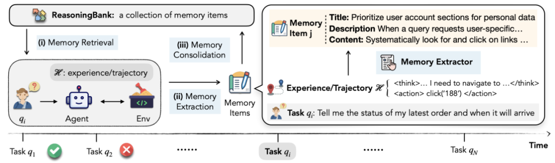 Aslında, daha önce, “ReasoningBank: Ölçekleme Aracısı, Akıl Yürütme Belleğiyle Kendi Kendini Geliştiriyor” başlıklı bir Google makalesi, Aracı Bağlam Mühendisliğine benzer bir kavram önermişti ——Muhakeme Bankası,Gerçek etiketlere ihtiyaç duymadan, aracının kendisi tarafından değerlendirilen başarı ve başarısızlık deneyimlerinden bellek öğelerini çıkaran ve düzenleyen, etmen sistemleri için yenilikçi bir bellek çerçevesi.