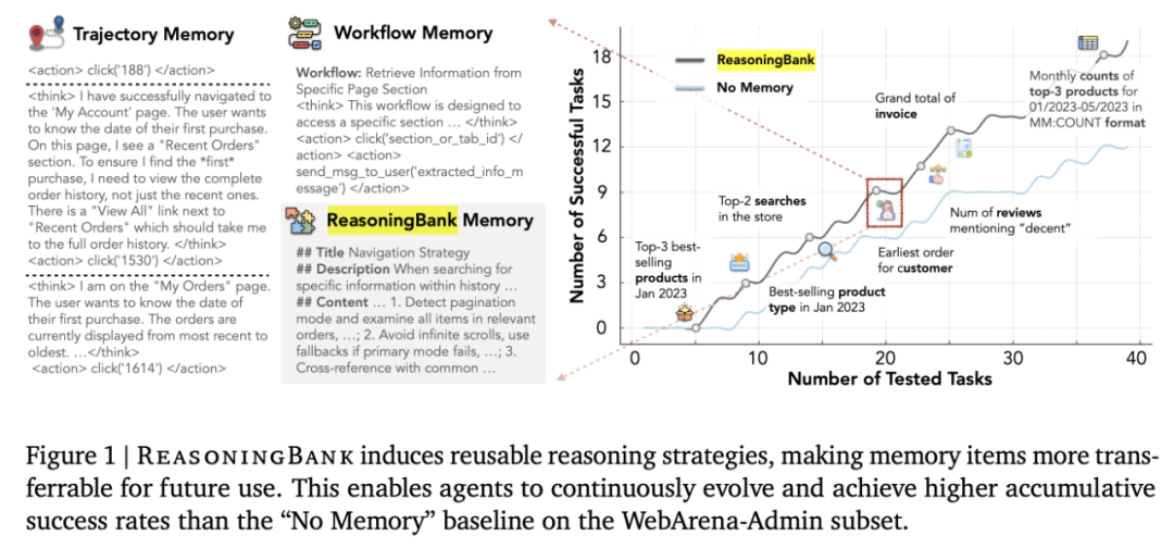 Şekil 1’de gösterildiği gibi, kullanarakMuhakeme BankasıBaşarıda yalnızca etkili stratejiler yakalamakla kalmaz, aynı zamanda başarısızlıktan önemli önleme dersleri çıkararak bunları bir dizi eyleme geçirilebilir ilkeye dönüştürebilirsiniz. Bu süreç kapalı bir döngüde çalışır: Temsilci, yeni bir görevle karşı karşıya kaldığında, eylemlerini yönlendirmek için ReasoningBank’tan ilgili anıları alır. Daha sonra yeni deneyimler analiz edilir, iyileştirilir ve ReasoningBank’e yeniden entegre edilir; böylece temsilcinin stratejik yeteneklerini sürekli olarak geliştirmesine ve geliştirmesine olanak sağlanır.