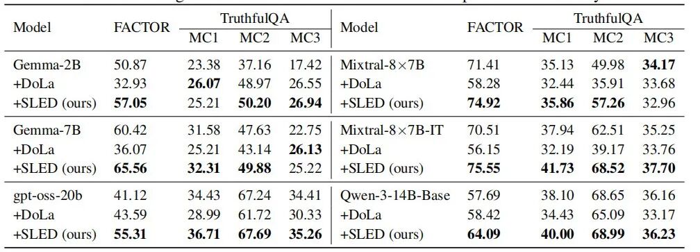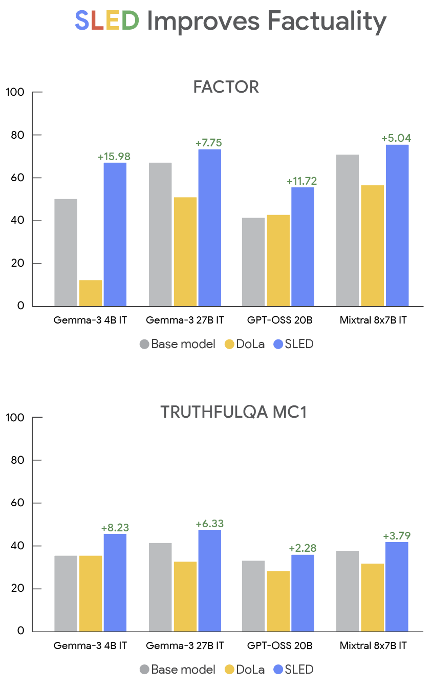 SLED, GPT-OSS, Mixtral, Qwen gibi farklı modeller ailesinde, temel kavramlardan ve performanstan üstünlüğünü gösteriyor.