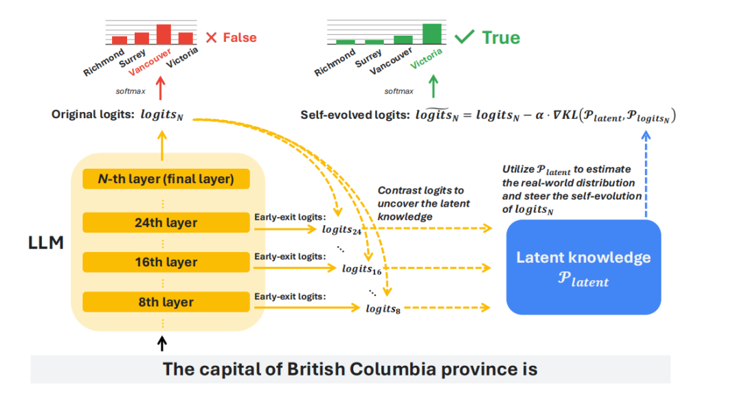 SLED’in Çoktan Seçmeli Soruları Nasıl Daha İyi Cevapladığını Gösteren Bir Demostrasyon. Tüm katmanların bilgilerini kullanarak, SLED+LLM doğru cevabı (Victoria) bulur, değilse Britanya Kolumbiyası’nın daha iyi bilinen şehri Vancouver yerine.