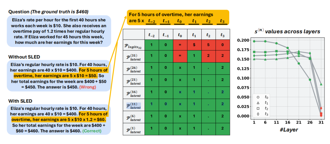GSM8K maaş hesaplama örneği. Normal model yanlış olarak 450 dolar gösterirken, SLED orta katman sinyaliyle sonucu doğru olarak 460 dolar yapar.