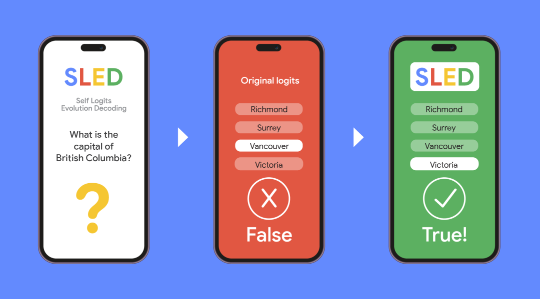 Son zamanlarda, Google araştırma ekibi NeurIPS 2024’te yeni bir yöntem olan SLED (Self Logits Evolution Decoding) tanıttı: amacı, dış bilgiye ihtiyacı olmadan, ek ince ayar yapmadan kendi içsel bilgisini kullanmak ve hayalleri azaltmak.