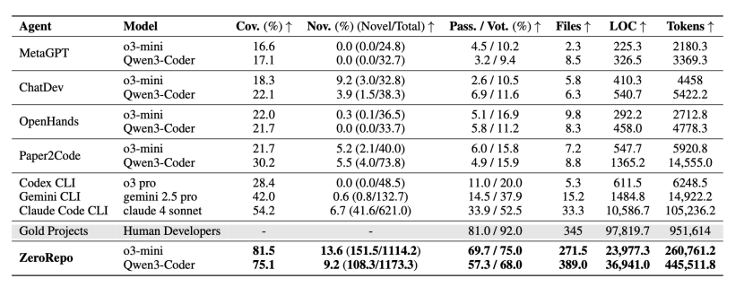 **Fonksiyon Kapsamı ve Ölçeği**: Kapsam oranı **%81.5**’e ulaştı ve en iyi temel model olan **Claude Code’dan 27.3 puan daha yüksek**; aynı zamanda **100’den fazla yeni fonksiyon** üretebiliyor (%11–13 yenilik oranı), diğer yöntemlerden çok daha iyi. Üretilen depoların ortalama **36 bin satır kod** ve **445 bin token** içermesi, Claude Code’un 3.9 katı, diğer yöntemlerin ise 64 katı büyüklüğünde ve karmaşıklığı manuel projelere yakın.