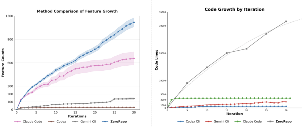 ZeroRepo, hem fonksiyon sayısı hem de kod ölçeği açısından **neredeyse doğrusal bir büyüme eğilimi** sergilemektedir.