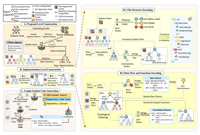 ZeroRepo Sürecine Genel Bakış: (A) Öneri Düzeyi Oluşturma: Kullanıcı gereksinimlerini fonksiyonel bir grafiğe dönüştürme; (B) Uygulama Düzeyi Oluşturma: Dosya yapısı ve veri akışına daha da detaylandırma, Repository Planning Graph (RPG) oluşturma; (C) Grafikle Güdümlü Üretim: RPG’nin topolojik sırasını takip ederek, eksiksiz depoyu adım adım oluşturma.