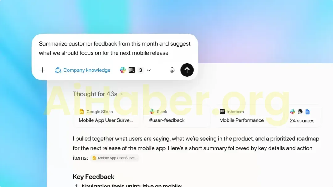 Yeni özellikle ChatGPT, kurum içindeki belgeler, e-postalar, mesajlar, görevler ve kod depoları gibi bilgileri kullanarak şirket operasyonlarıyla ilgili daha isabetli yanıtlar verebilecek. Amaç; ekiplerin daha hızlı karar almasını ve verimli iş birliği yapmasını sağlamak.