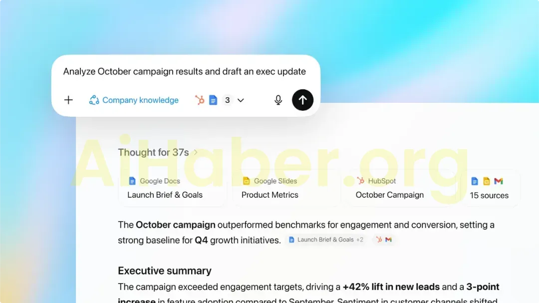 Örneğin, bir müşteri toplantısına hazırlık yaparken ChatGPT; Slack kanalları, müşteri e-postaları, Google Docs toplantı notları ve Intercom destek taleplerini bir araya getirip bir özet rapor hazırlayabilecek.
